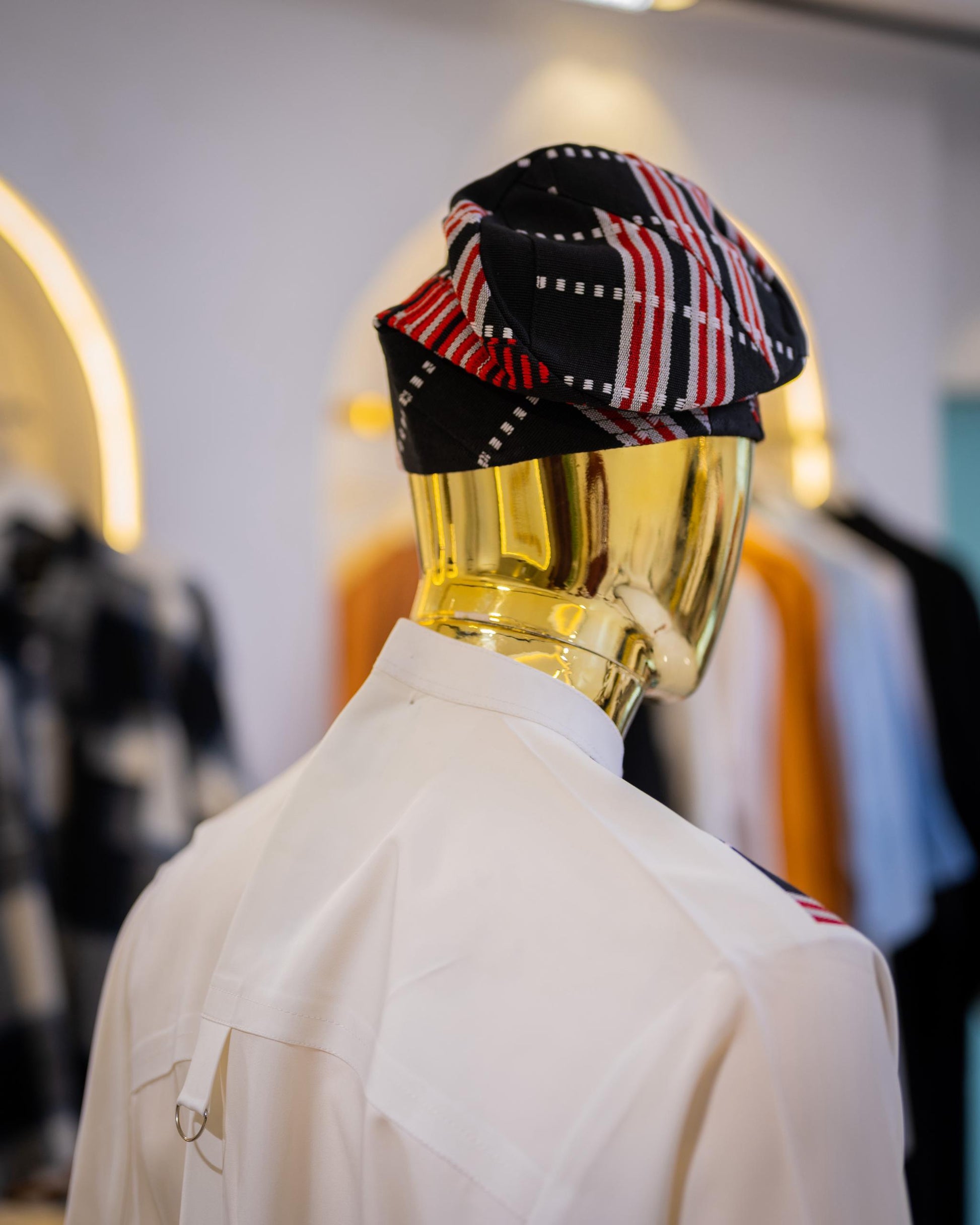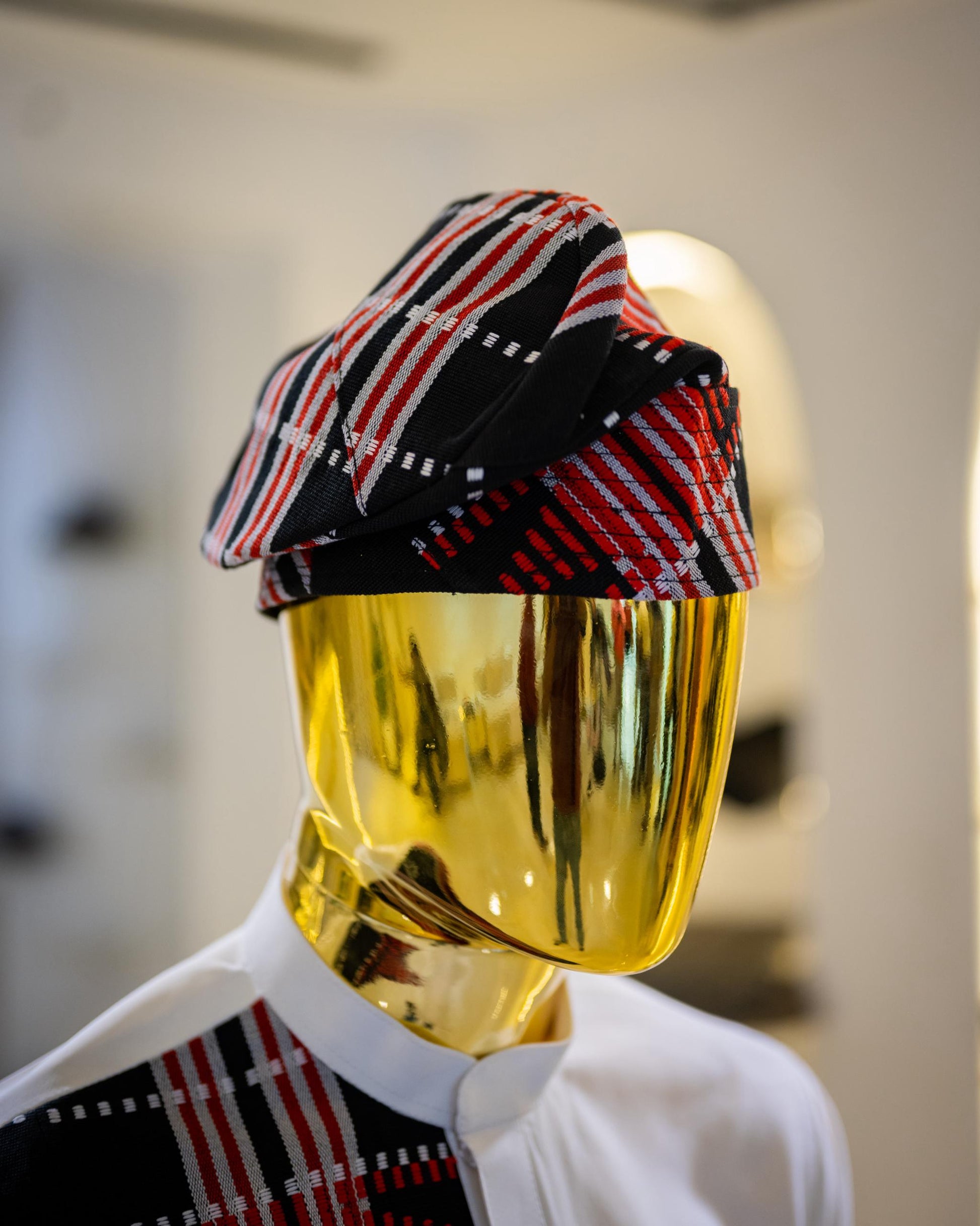 The minimalist design is complemented by a matching striped cap, completing a look that’s both ceremonial and contemporary.