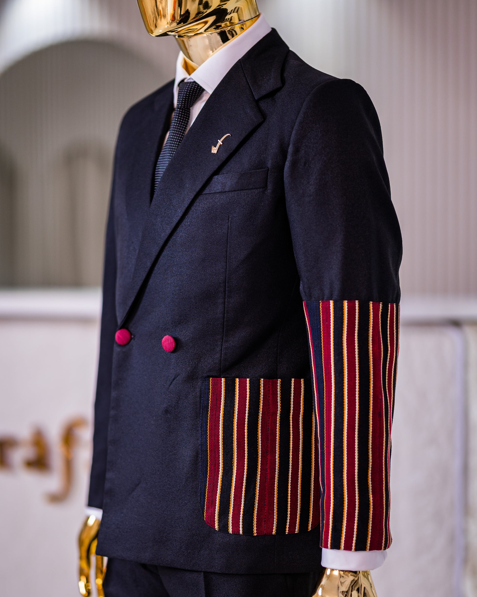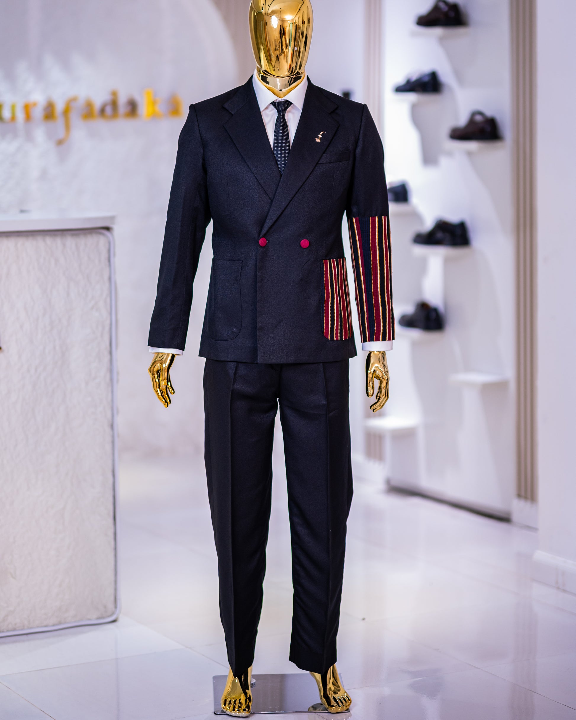 The Akinwole Deluxe Suit is a stylish and unique two-piece double breasted two-button suit designed for the contemporary man. The suit features a notch lapel, and intricately designed side patch pockets, with the left side patch pocket and half way through the left sleeve made from luxurious traditional fibres giving it a luxurious and elegant appearance.