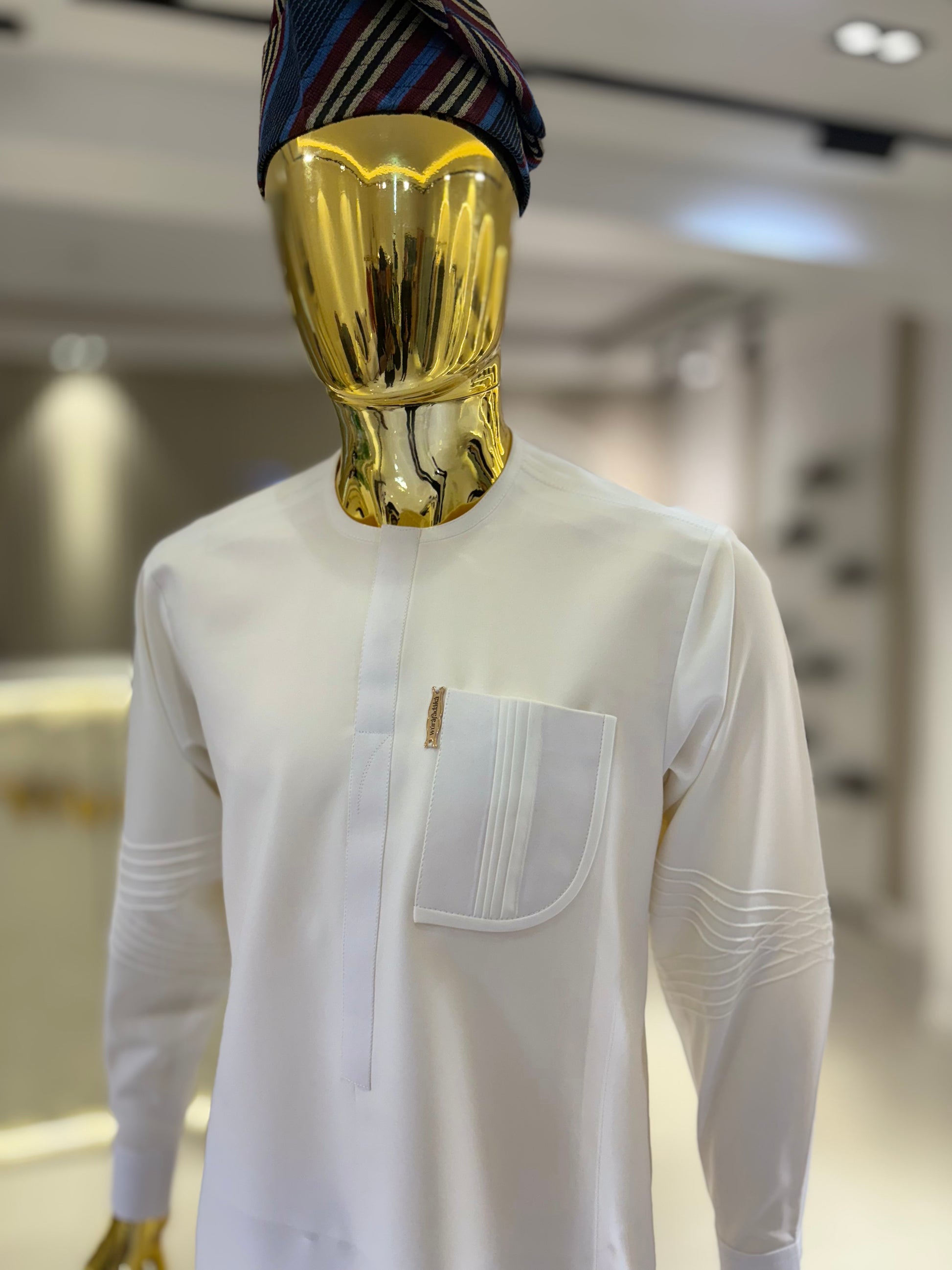 Chest pocket and sleeves are plain and intricately pleated