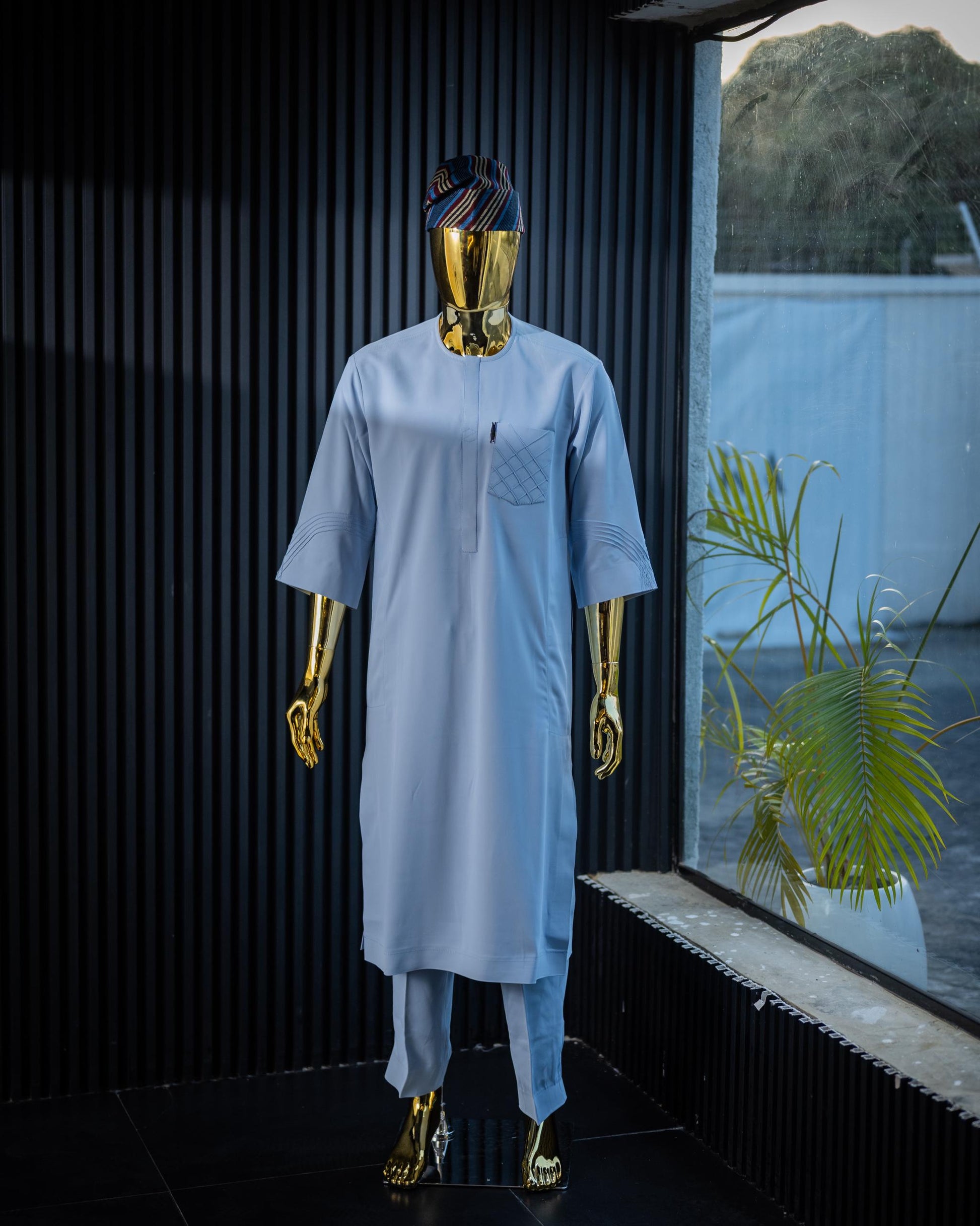 Light, refined, and effortlessly sophisticated—the Gbenga Kaftan is made for the gentleman whose presence speaks calm confidence and quiet class. Rendered in a soothing sky-blue tone, this piece combines modern tailoring with traditional elegance.