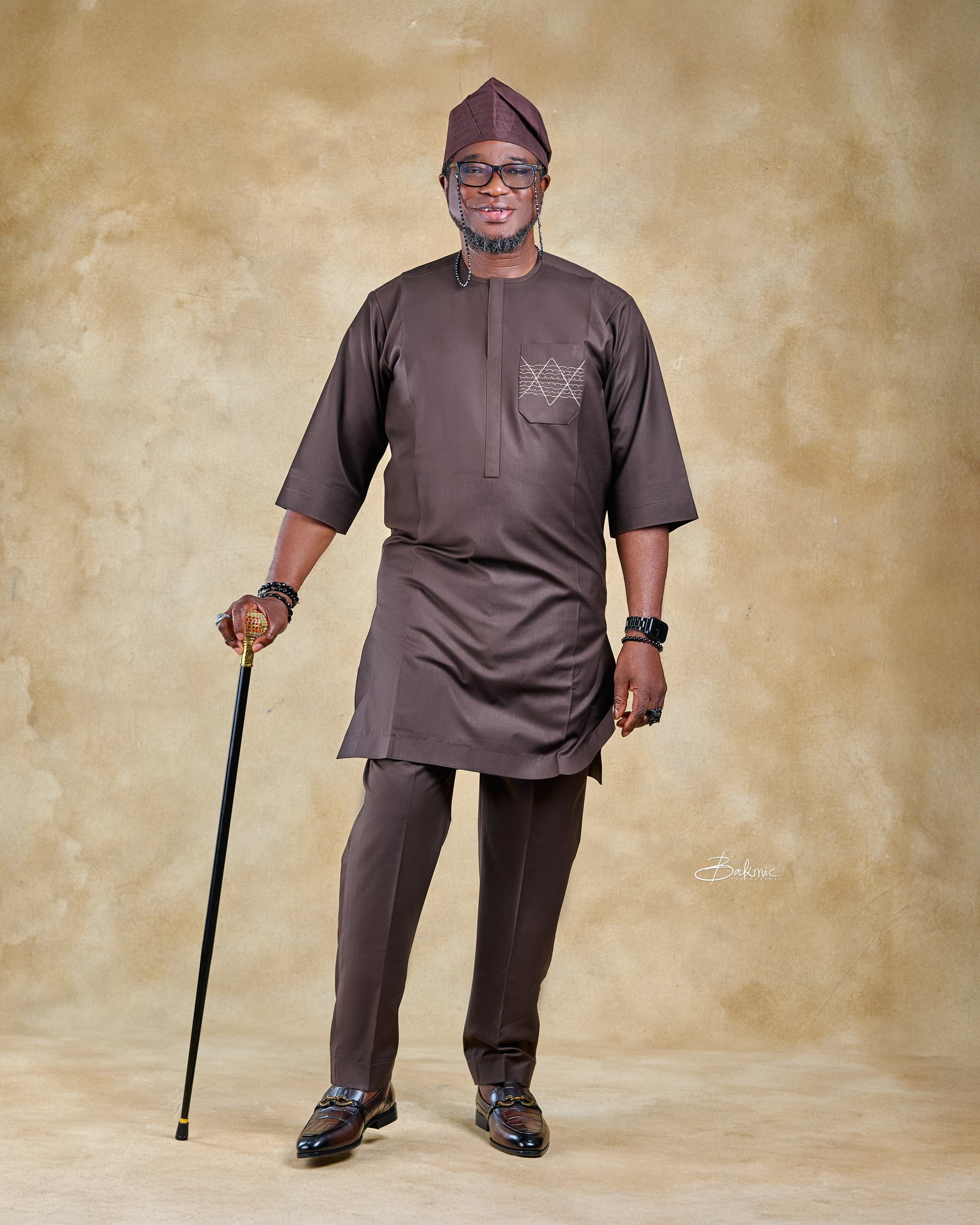 The OLUSOJI KAFTAN is a well-tailored kaftanin a smooth chocolate-brown fabric. The drape is clean and structured, giving a powerful yet refined silhouette.