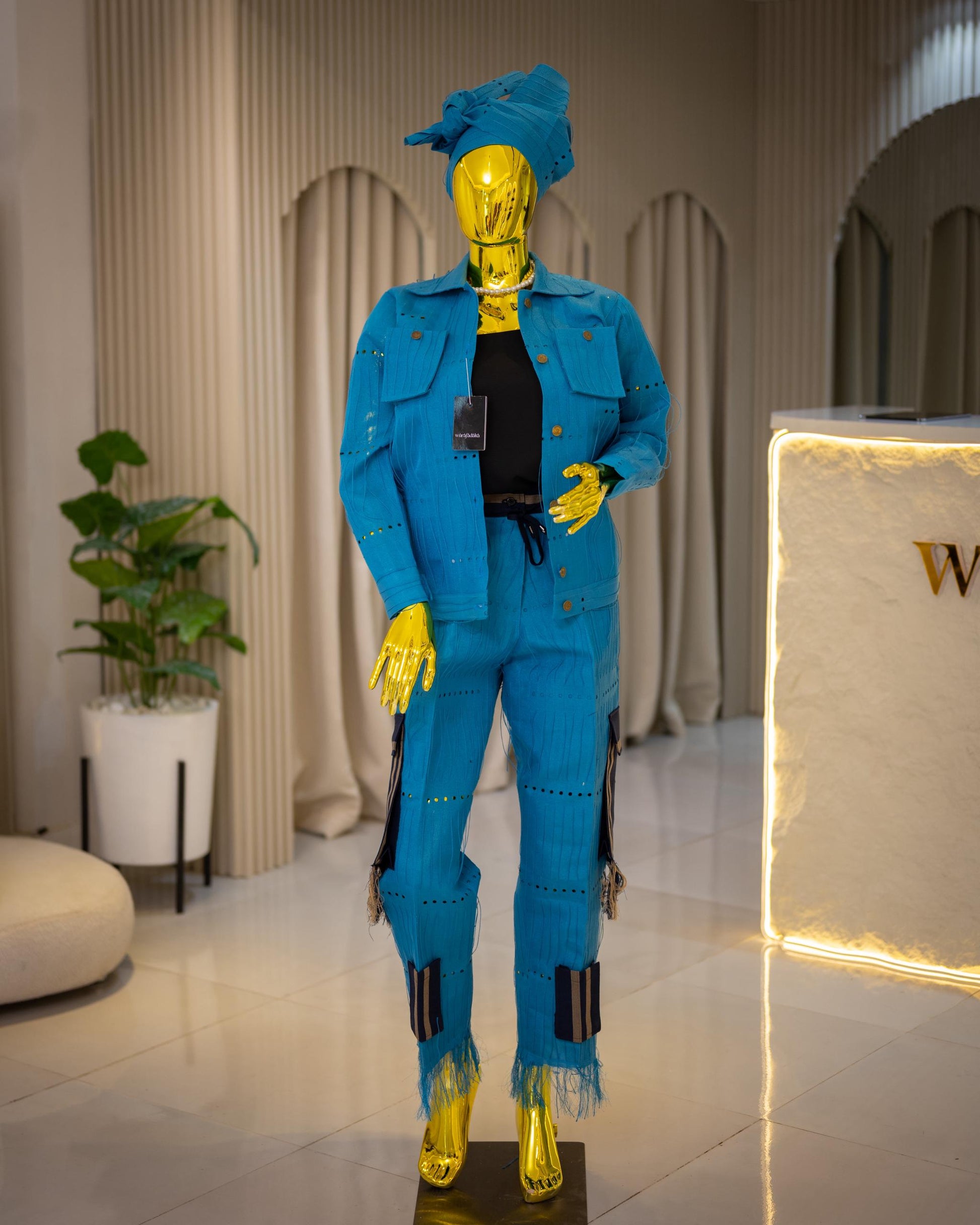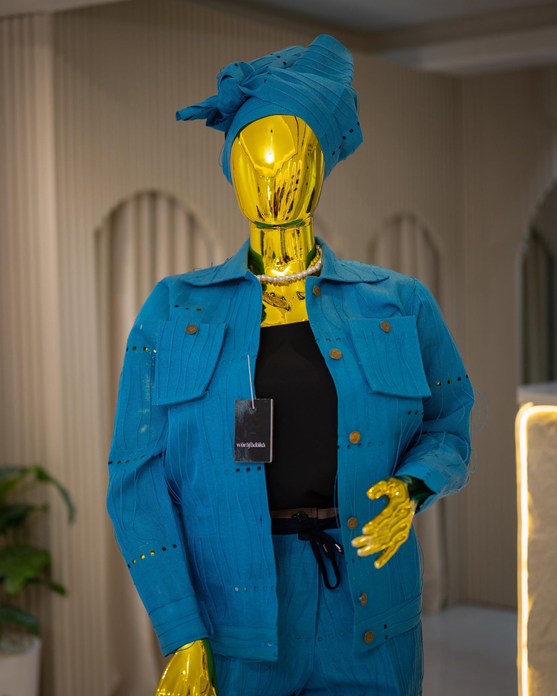 Turn heads and own your space in this striking classic set, crafted from premium textured fabric in a bold electric blue hue. The set features a hand-detailed jacket, coordinating high-waisted trousers with fringe and patchwork embellishments.