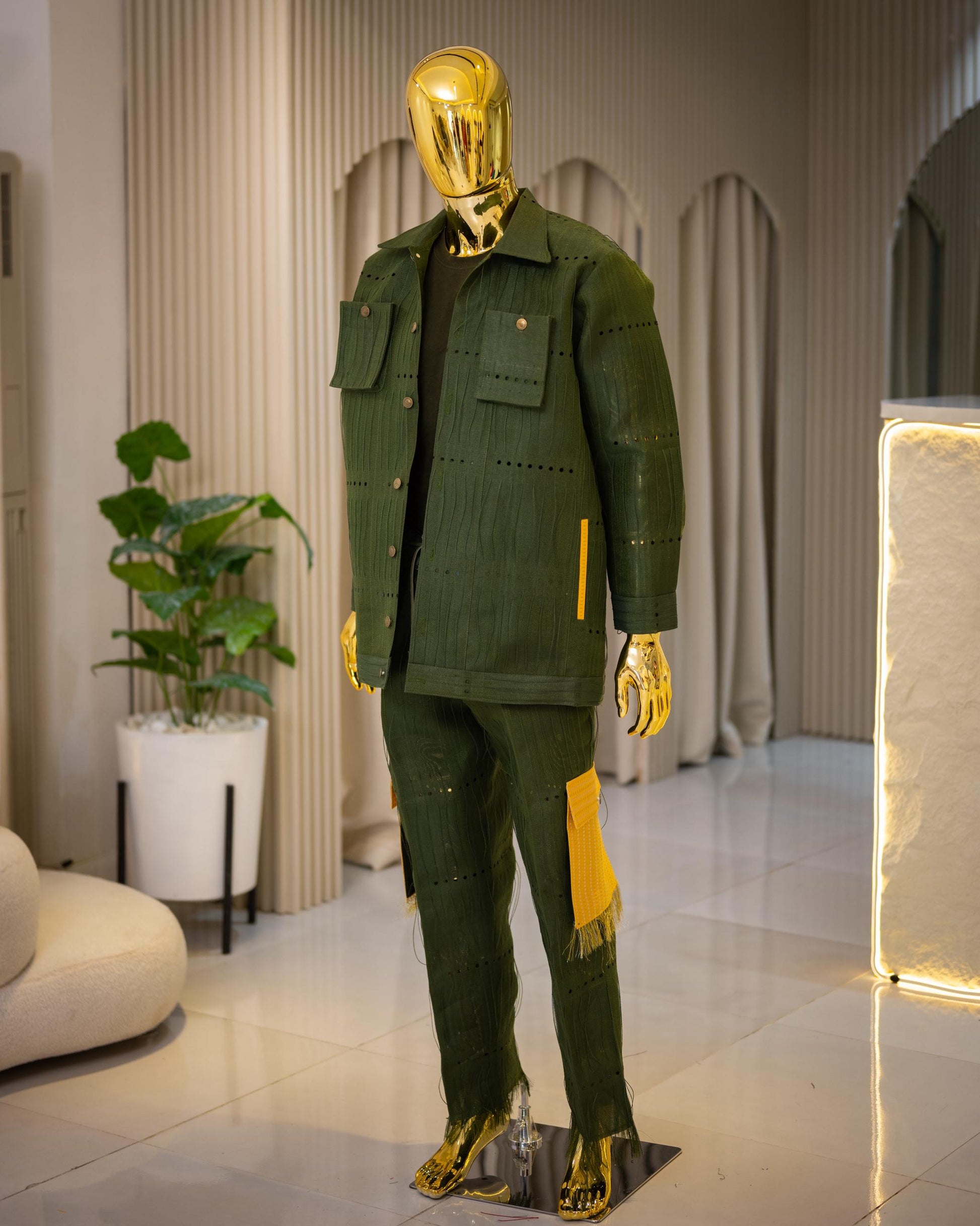 - Rich olive green cargo-style trousers with yellow patch pocket and fringe at the pocket base for modern authenticity.